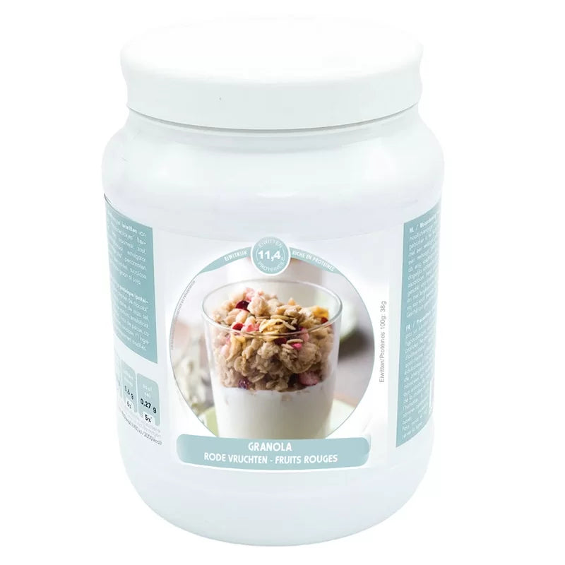 Ingrediënten: Eiwitmengeling (isolaat van soja-eiwit, melkeiwit), volkoren havervlokken (gluten), suiker, gedroogd fruit (8,5%) (frambozen, aardbeien, veenbessen), koolzaadolie, tapioacazetmeel, fructo-oligossachariden, aroma’s.