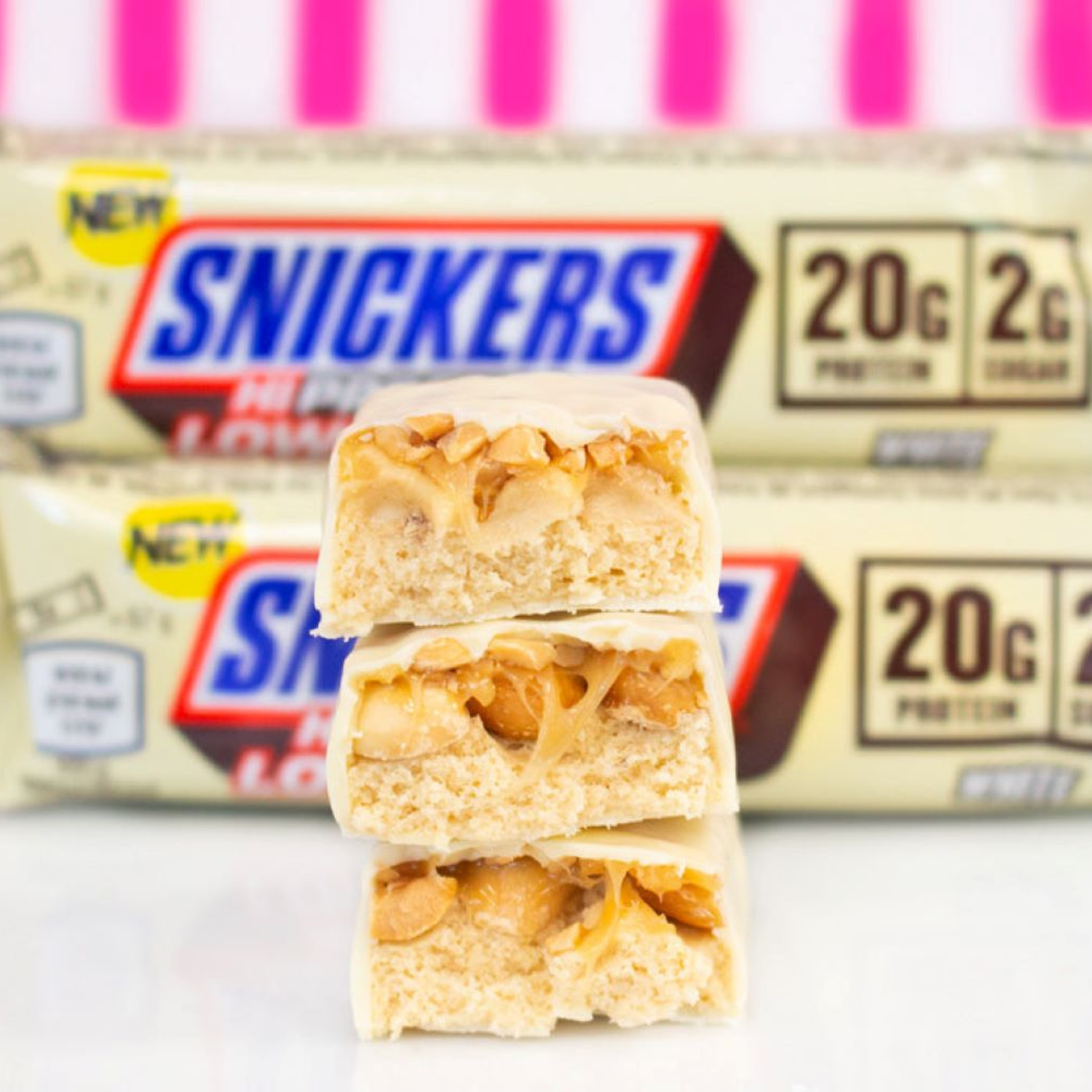 Snickers WHITE Low Sugar Hi Protein Bar is een ideale eiwitsnack. Snickers WHITE Low Sugar Hi Protein repen bevatten maar liefst 20g eiwitten en slechts 2g suiker! Deze eiwitreep bevordert de toename van de spiermassa en is een uitstekend alternatief voor chocoladerepen met veel suiker en veel calorieën. Eiwitten zorgen voor een voldaan gevoel (stillen de honger) en dragen bij tot instandhouding van de spiermassa.